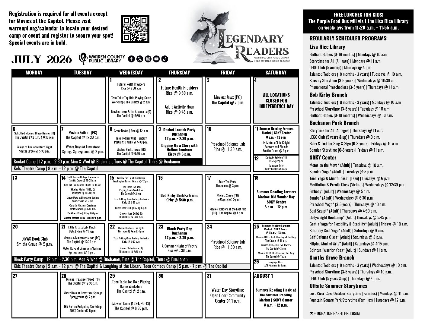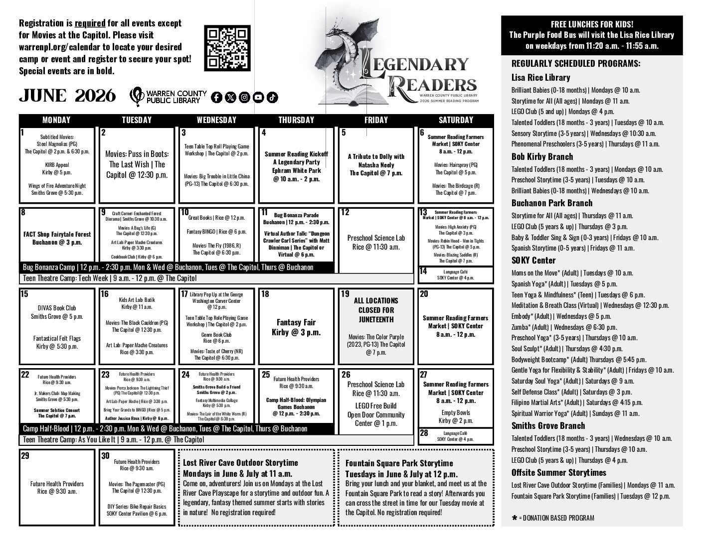 WCPL joins forces with Warren County Parks & Recreation to host 4-day “camps” for families with children in elementary school. At least one adult must register to attend all sessions, with a group of no more than 10 children per group. Mondays, Wednesdays, and Thursdays take place at Micheal O. Buchanon Park; Tuesdays are hosted at The Capitol, where kids will enjoy a thematic movie. Registration is required